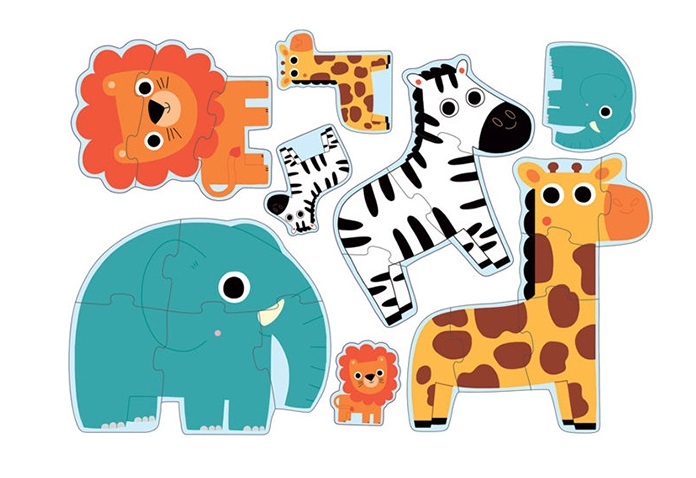 Περιλαμβάνει 3 τεμάχια για το λιοντάρι παζλ, 4 τεμάχια για το ζέβρα παζλ, 5 τεμάχια για τον ελέφαντα παζλ και 6 τεμάχια για την καμηλοπάρδαλη παζλ.