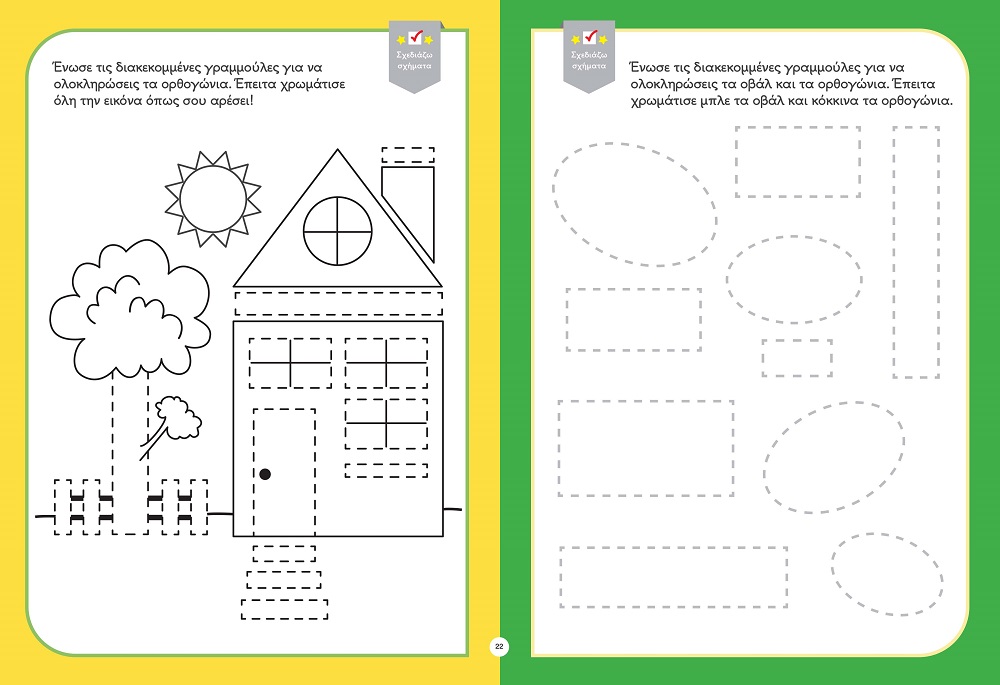 Ζωγραφική, ασκήσεις προγραφής, παρατηρητικότητας και λογικής, μοτίβα, λαβύρινθοι, ζεύγη αντιθέτων, σχήματα, χρώματα, εικονο-ιστορίες, εκμάθηση γραφής γραμμάτων και αριθμών…