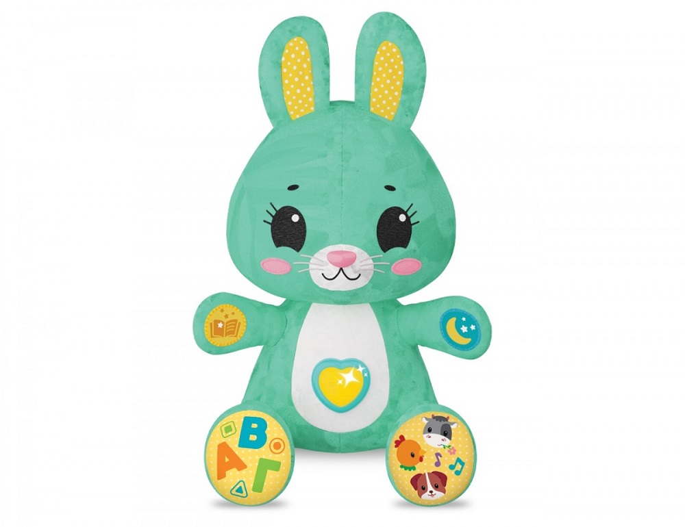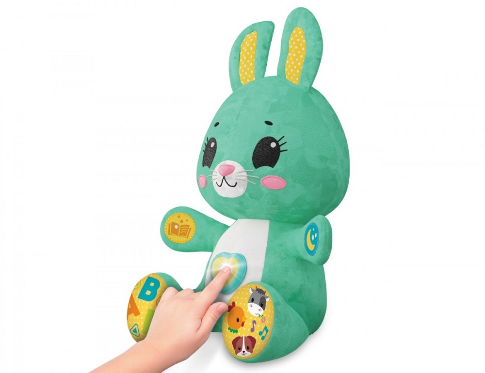 Πιέζοντας την κοιλίτσα του που φωτίζει και τις μαλακές του πατούσες, το παιδί μπορεί να ακούσει αστείες συνθέσεις με ήχους από ζώα της φάρμας, 4 αγαπημένα παραμύθια, τρυφερά νανουρίσματα, καθώς και να τραγουδήσει μαζί του αγαπημένα Ελληνικά παιδικά τραγουδάκια.